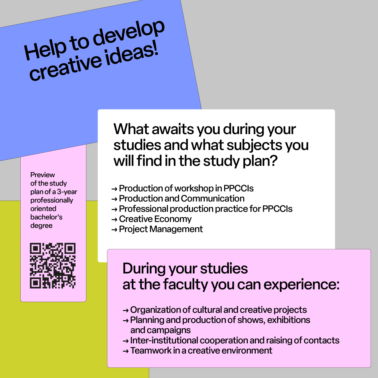 The study is suitable for those interested in production in the field of creative arts, especially in the areas of fine arts, new media, design and graphic design, including presentation and institutional practice focusing on planning and organizing cultural programs, one-off events and public art activities, creative workshops or festivals.