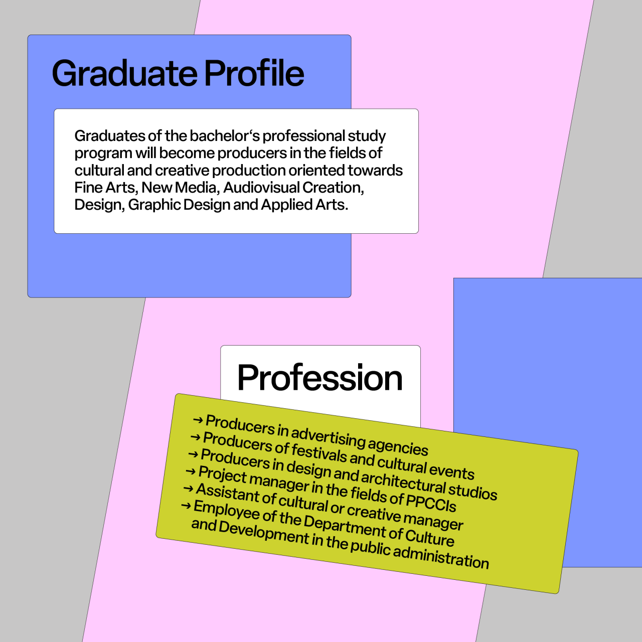 Graduates of the bachelor's professional study program will become producers in the areas of cultural and creative production oriented towards fine arts, new media, audiovisual work, design, graphic design and applied arts. You can work in private creative companies with an orientation towards product and graphic design or crafts, in companies focusing on the gaming industry, in cultural institutions, public administration institutions, monuments, art galleries and museums, but also at festivals and in theaters, mass media, and advertising agencies.
