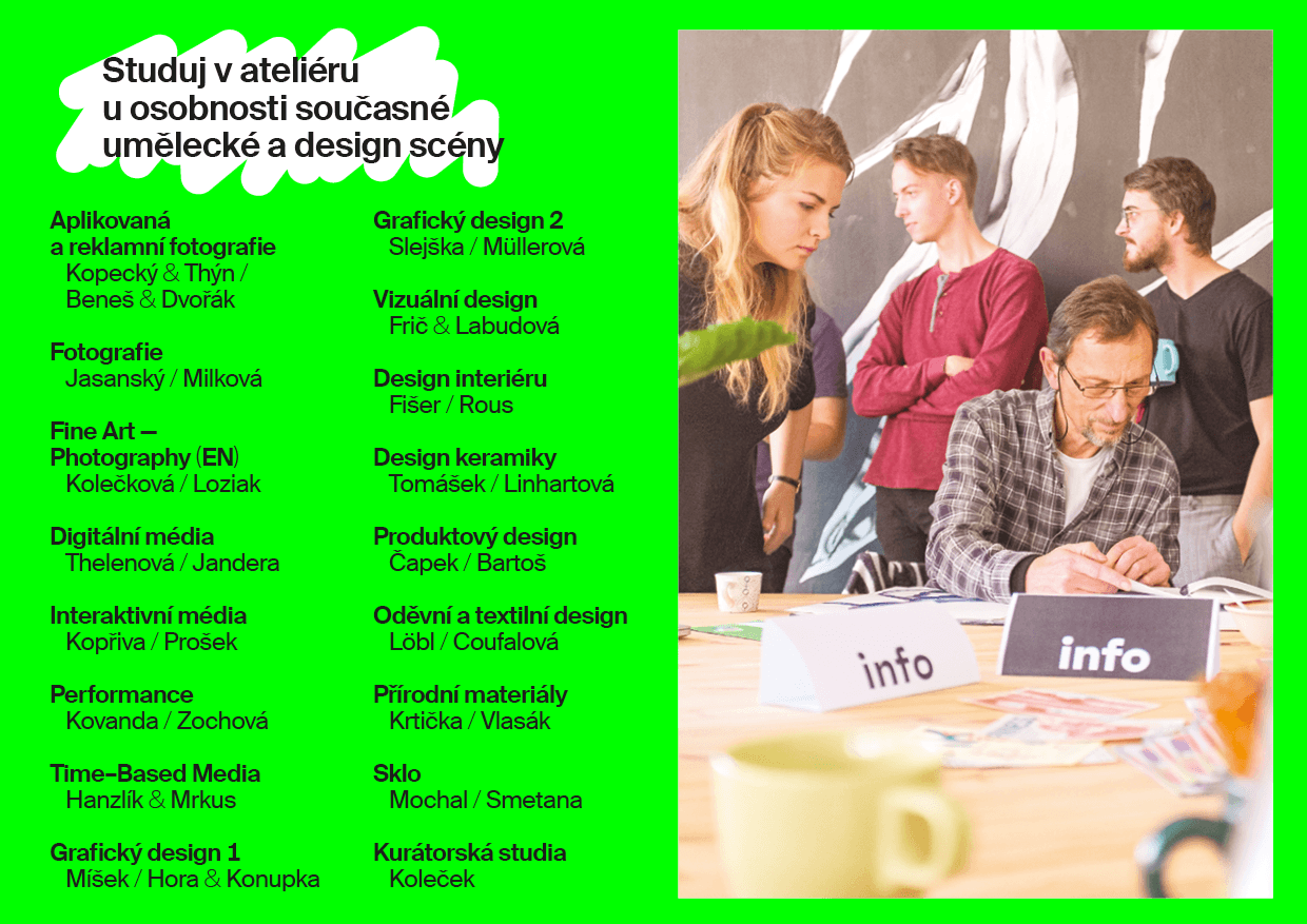Souhrnné informace ohledně ateliérů, studia, podávání přihlášek ke studiu a přijímacích zkoušek jsou zveřejněny na našem webu, Facebookových stránkách nebo v Manuálu pro uchazeče, který naleznete ke stažení níže.